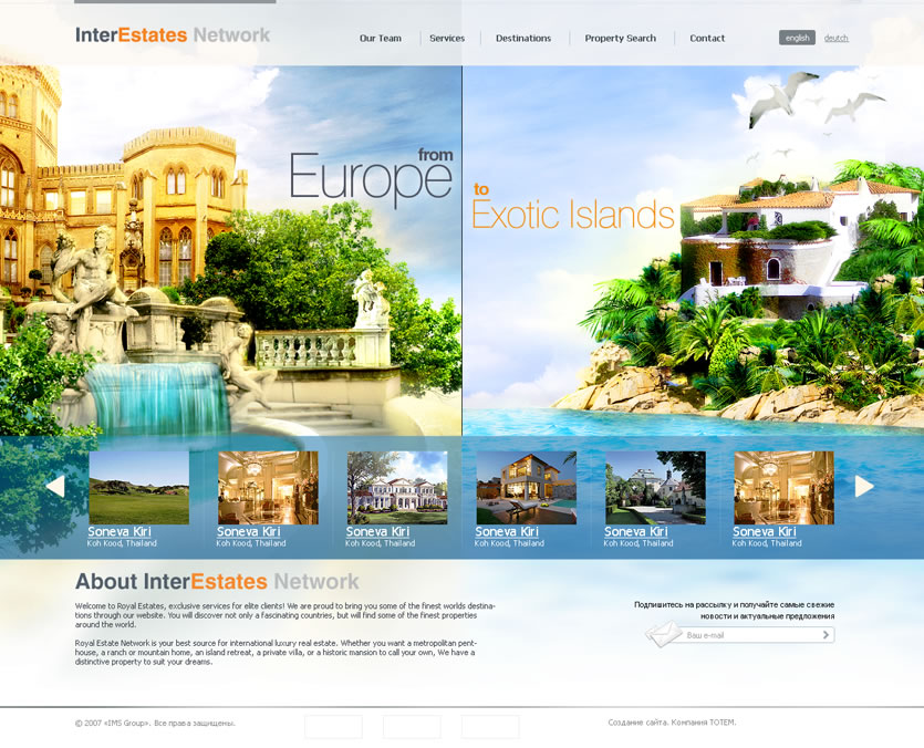 Коммуникационный посыл, который несет в себе концепция сайта: жизнь и возможности, которые не имеют границ — «From Europe to Exotic Islands».