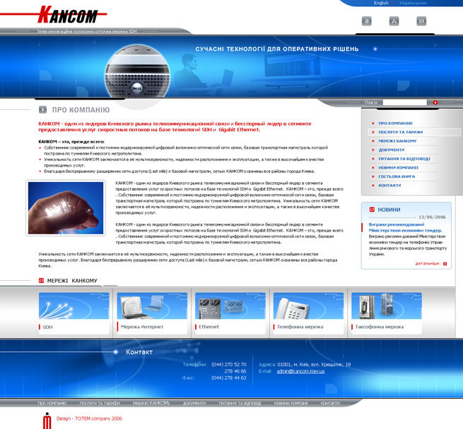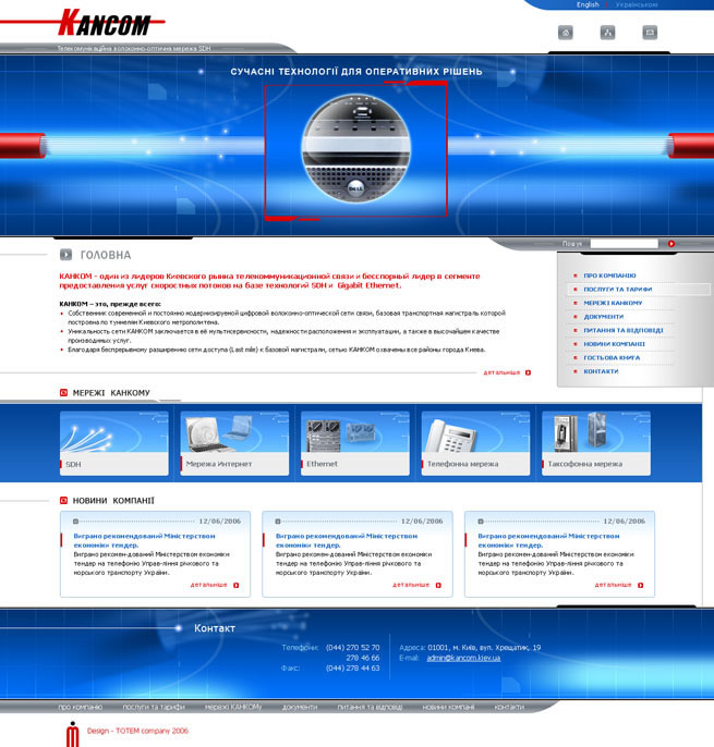 Этот строгий информационный портал был создан в концепции «Надёжность. Лидерство. Оперативность». Основная идея графически воплощена в разработке 3D заставки: высочайшие качество и скорость передачи информации гарантирует профессиональное оборудование, мультисервисная и надёжно расположенная сеть связи «Канком» (её базовая магистраль построена по туннелям Киевского метрополитена, что также анимировано и является составляющей графического идейного решения).