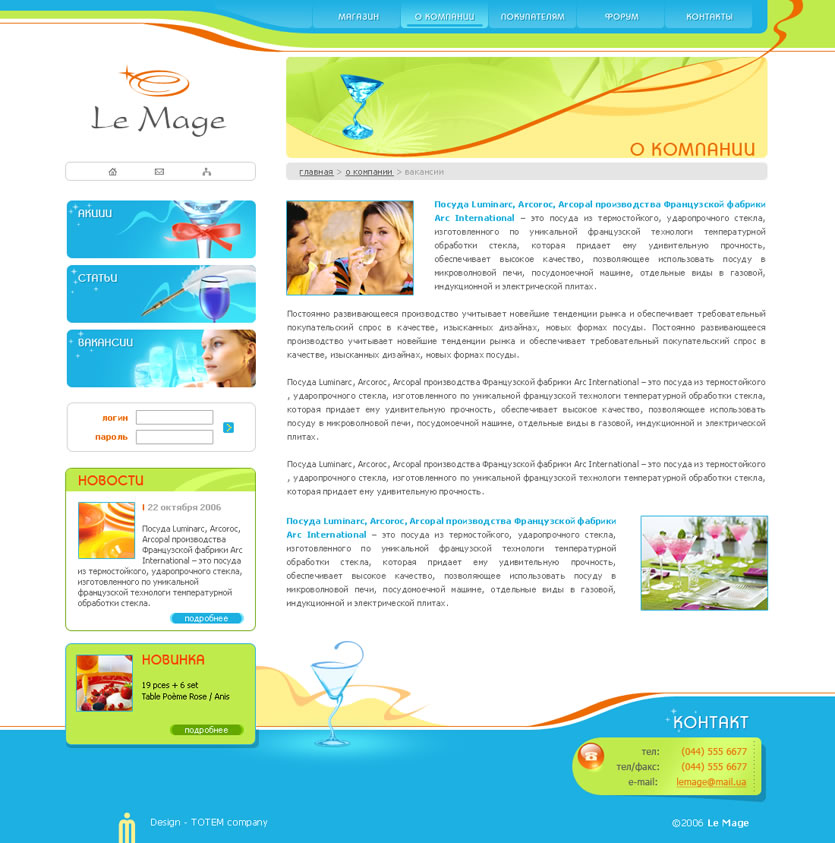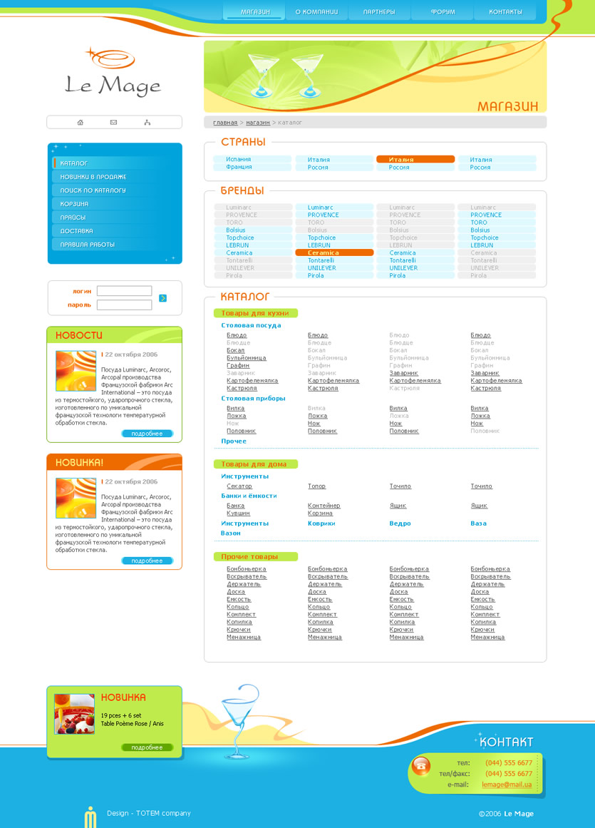 Мы создали ресурс, который решает несколько задач компании. С одной стороны это функциональный электронный магазин, с другой, яркий красочный дизайн сайта с танцующими бокалами, создающий атмосферу веселья и праздника.