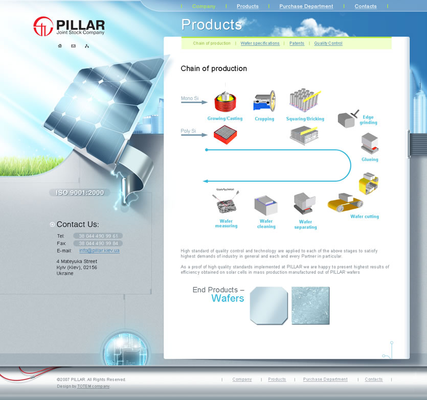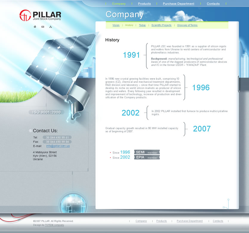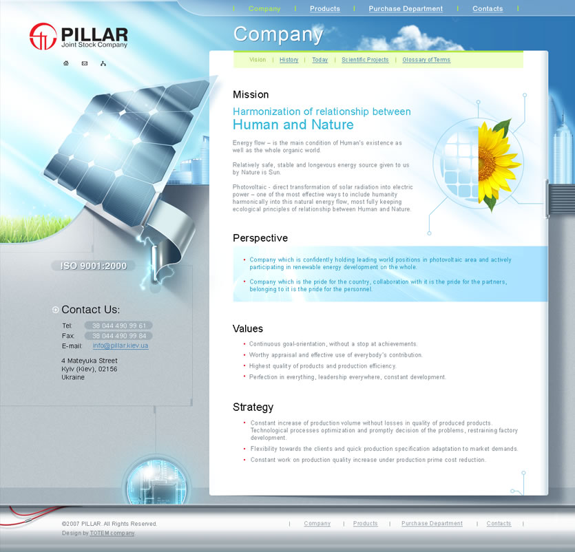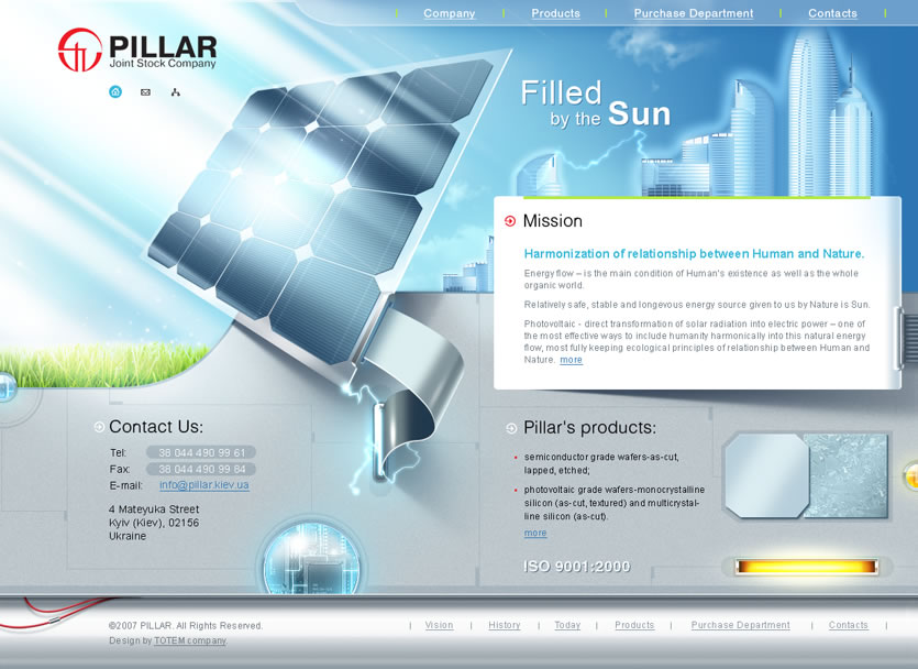 Имиджевый сайт для компании «Пиллар» создан в стиле hi-tech, который полноценно передает суть глобальной миссии компании: «Энергия солнца в каждый дом!».